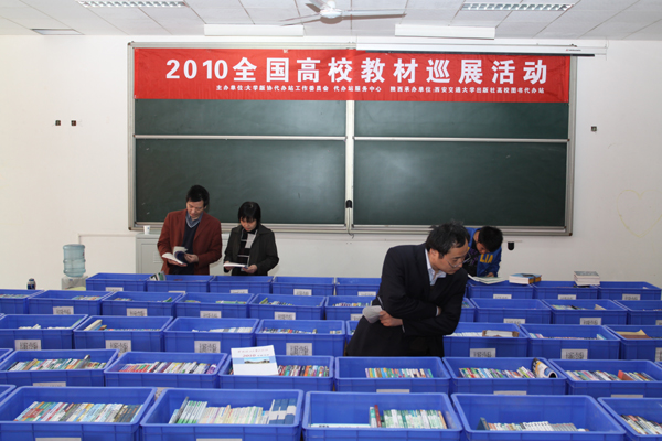 (本網訊)為了使教師及時了解各學科最新教材發展成果,為學科建設、教材建設和教材選用提供服務。4月8日,教務處教材科特邀大學代辦站工作委員會在西安工大未央校區舉辦了“2010年全國高校出版社教材巡展”活動。北京師范大學、西安交通大學等20多家大學出版社提供了近3年來4000多種最新優秀教材、獲獎教材、精品教材及配套教輔樣書與學校師生見面,同時贈送給教師部分樣書、最新圖書目錄等。各出版社編輯直接與廣大教師進行了面對面交流,認真聽取了廣大師生的意見及建議;有出版意向的教師還與出版社就如何做好教材編寫及出版工作進行了深入探討。