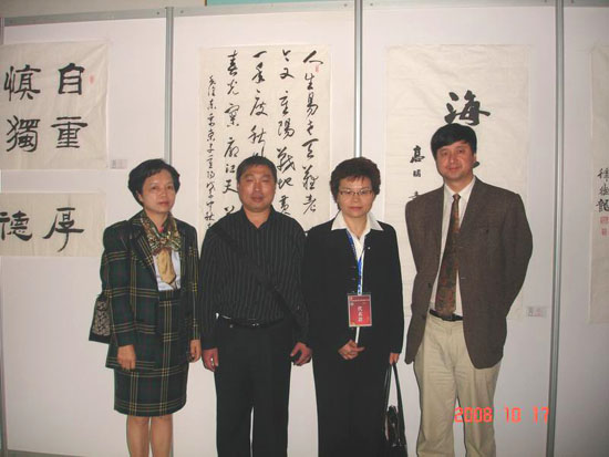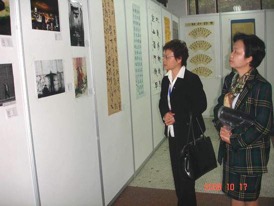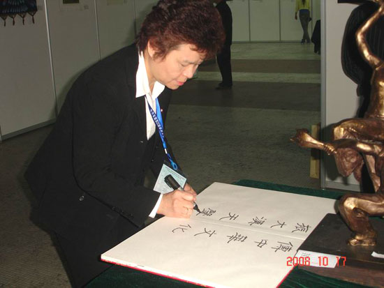 詹秀蓉女士在學(xué)校國際交流與對外合作處和學(xué)校僑聯(lián)負責(zé)人陪同下在金花校區(qū)饒有興趣地參觀了由陜西省教育廳主辦、本校藝術(shù)學(xué)院承辦的陜西省第二屆大學(xué)生書畫展,對陜西省大學(xué)生尤其西安工大學(xué)生的書畫作品給予了很高評價。在與校藝術(shù)學(xué)院暨書法系老師和學(xué)生的交流中,詹秀蓉女士激動地說:看到規(guī)范的書法專業(yè)設(shè)置,感受到了大陸對中國書法文化的重視;看到大陸學(xué)生的優(yōu)秀的書畫作品,就看到了中華文化傳承的希望所在。她在留言薄上題寫下:“傳中華文化,振大漢天聲”,表達自己心情和對學(xué)生的希望。隨后她還同老師及在全國書法比賽獲獎的學(xué)生合影。