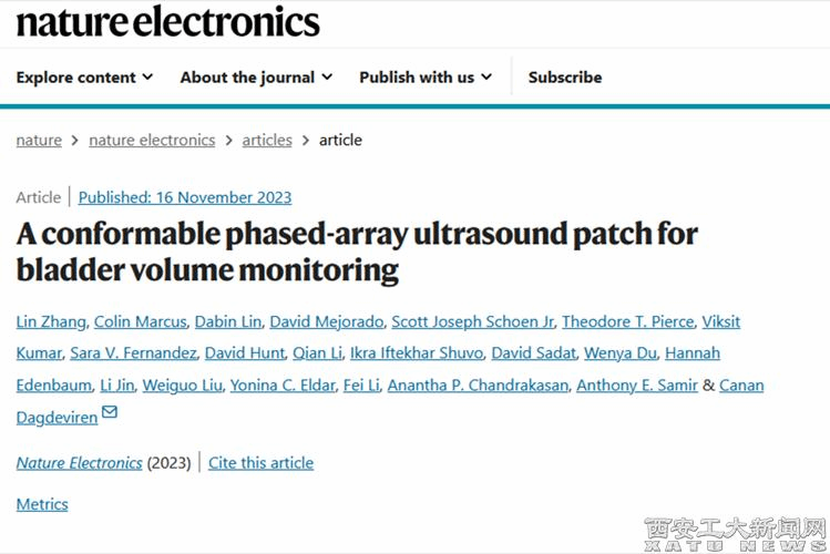 (本網訊)近日,西安工業大學光電工程學院林大斌教授等與美國麻省理工學院(MIT)Canan Dagdeviren教授團隊合作的研究成果(A conformable phased-array ultrasound patch for bladder volume monitoring)以研究長文(Research Article)形式發表于Nature子刊《Nature Electronics》(影響因子34.3,工程技術1區Top期刊)。林大斌教授為共同第一作者,劉衛國教授為共同作者(論文原文鏈接:https://www.nature.com/articles/s41928-023-01068-x)。論文報道了基于嵌入可拉伸基底的相控陣超聲膀胱貼片。相控陣使用Sm/La稀土元素共摻雜的Pb(Mg1/3Nb2/3)O3–PbTiO3陶瓷作為核心材料。在膀胱監測的初步臨床研究中使用了該超聲貼片,貼片的膀胱容量估計具有可比性(相對誤差為3.2?±?6.4%和10.8?±?8.2%)與使用標準臨床超聲設備獲得的相比,不需要操作者手動平移或旋轉。該研究成果可用于人體組織成像,開展疾病早期診斷和監測。