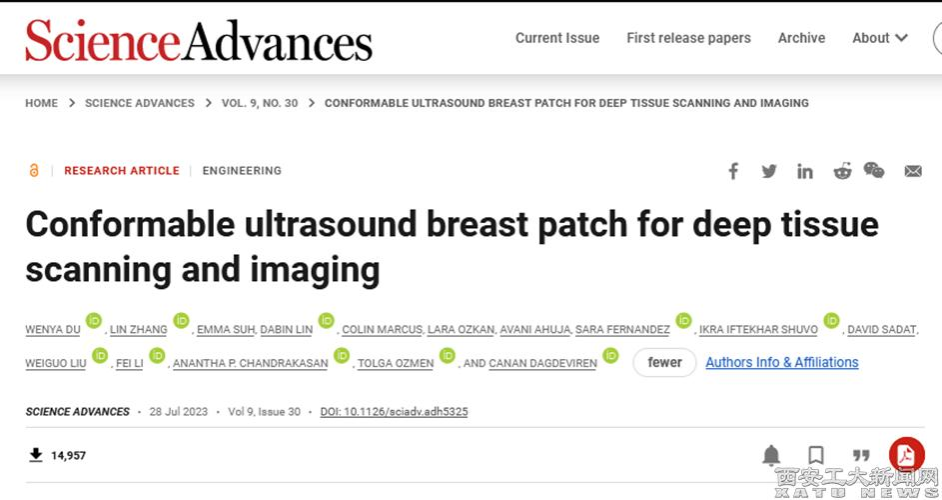 今年8月,該團隊另一項用于乳腺癌早期診斷的研究成果(Conformable ultrasound breast patch for deep tissue scanning and imaging)以研究長文(Research Article)形式發表于Science子刊《Science Advances》(影響因子13.6,綜合性期刊1區Top期刊),林大斌教授為共同第一作者,劉衛國教授為共同作者(論文原文鏈接:https://www.science.org/doi/10.1126/sciadv.adh5325)。論文報道了一種可穿戴、適形的超聲乳房貼片(cUSBr-patch),實現了整個乳房的標準化和可重復的圖像采集。研發的蜂窩形貼片與相控陣相結合,具有大面積、深度掃描和多角度乳房成像能力。體外研究和臨床試驗表明,采用新型稀土共摻雜壓電晶體[Yb/Bi-Pb(In1/2Nb1/2)O3-Pb(Mg1/3Nb2/3)O3-PbTiO3](Yb/Bi-PIN-PMN-PT)的陣列在30mm人體組織深度處具有高的對比度(~3dB)和0.25/1.0mm的軸向/橫向分辨率,從而可以觀察到乳房中的小囊腫(~0.3cm)。該研究成果實現了對軟組織的實時動態監測。
