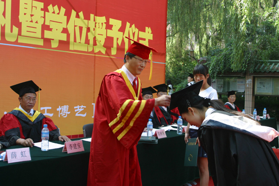 在激昂的畢業(yè)歌中,校長劉江南、學(xué)院黨委書記簡林根等領(lǐng)導(dǎo)分別為取得學(xué)士學(xué)位證書的畢業(yè)生撥穗,授予學(xué)位證書,并合影留念。