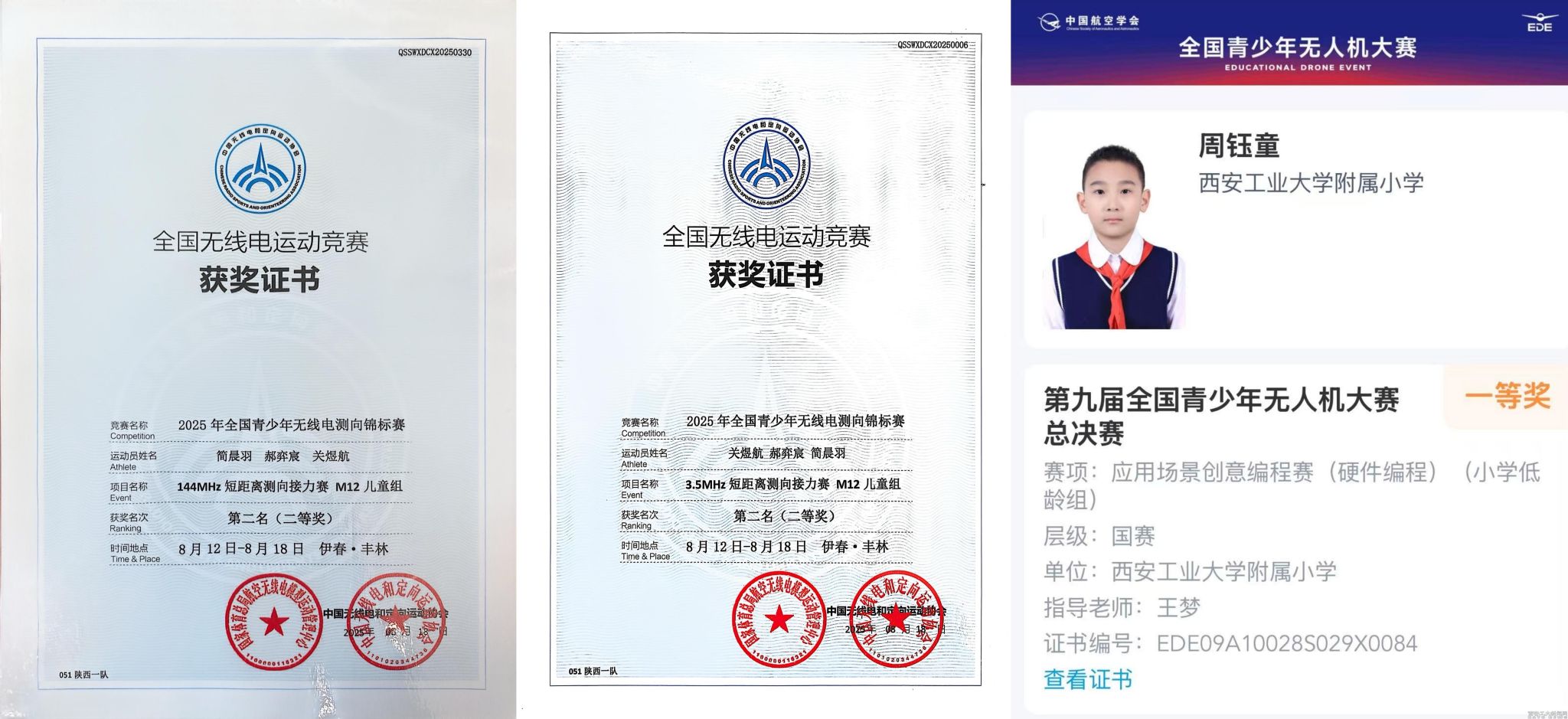 (本網訊)近日,我校附屬小學學生郝弈宸、簡晨羽在2025年全國青少年無線電測向錦標賽中獲得兩項第二名,周鈺童在第九屆全國青少年無人機大賽總決賽中獲一等獎。
