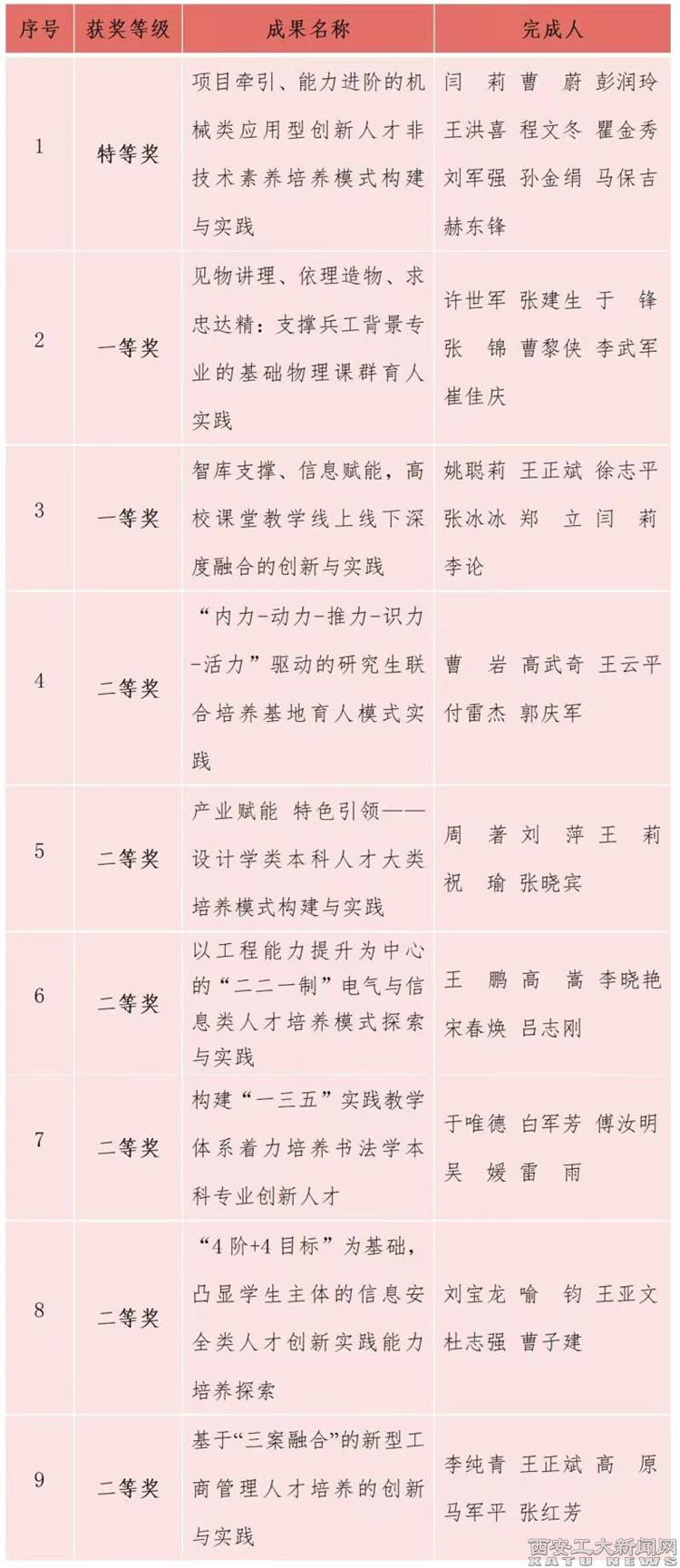 隨著各項措施落地生根,學校獲得省級教學成果獎9項,獲得全國高校教師教學創新大賽國賽一等獎1項、二等獎1項,獲得全國第三屆金工/工訓青年教師微課教學競賽一等獎1項,獲評中國電子學會(國家一級學會)2021年度優秀碩士學位論文1篇,獲評中國復合材料學會優秀碩士學位論文提名獎1項。