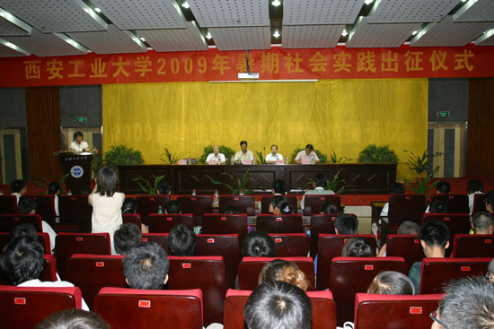 (本網訊)7月2日下午,西安工業大學2009年暑期社會實踐出征儀式在未央校區圖書館一樓報告廳舉行。黨委副書記丁養斌出席儀式,教務處、學生處、團委等部門領導及全校各院系團總支書記和三百余名實踐隊員參加了儀式,儀式由團委副書記趙瓊主持。