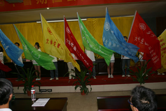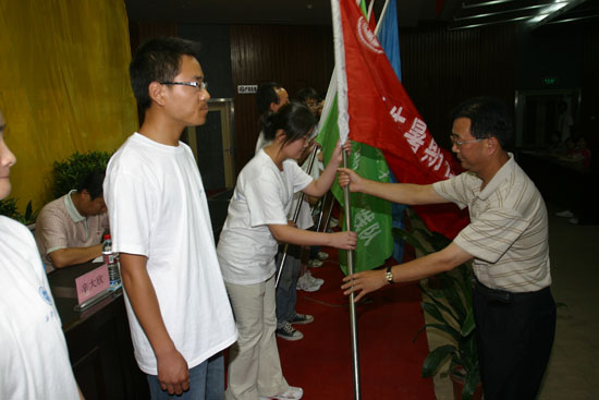 隨后,舉行隆重的授旗儀式,丁養斌副書記向10支實踐隊領隊代表授旗。主席臺上,同學們揮舞著實踐隊旗,整裝待發。