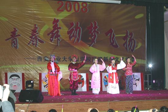晚會(huì)在歡樂(lè)的《迎新曲》中拉開(kāi)帷幕。熱情奔放、動(dòng)感十足的勁舞《光》和街舞《Keep On Dancing》充分顯示了當(dāng)代大學(xué)生激昂奮進(jìn)的精神面貌;蘊(yùn)含古典與現(xiàn)代魅力的舞蹈《大唐貴妃》、《愛(ài)蓮說(shuō)》更是帶人走進(jìn)了一個(gè)如夢(mèng)如幻的詩(shī)一般的意境,讓觀眾領(lǐng)略和感受了那純美悠久的文明;小品《生死救援隊(duì)》、女生獨(dú)唱《愛(ài)在天地間》,講述了汶川地震,全國(guó)人民萬(wàn)眾一心支援災(zāi)區(qū)的感人故事,讓人潸然淚下;配樂(lè)詩(shī)朗誦《見(jiàn)證2008》、小品《奧運(yùn)也瘋狂》謳歌了偉大祖國(guó)改革開(kāi)放30年來(lái)取得的輝煌成就,博得在場(chǎng)觀眾陣陣掌聲;小品相聲《文科生,理科生》詼諧幽默;女聲獨(dú)唱《幸福萬(wàn)年長(zhǎng)》、藏舞《吉祥謠》以優(yōu)美的旋律和曼妙的舞姿表達(dá)了對(duì)美好未來(lái)的憧憬與祝福;而細(xì)膩、亢奮有力的《戲曲聯(lián)唱》更是演繹了一場(chǎng)民族傳統(tǒng)戲劇藝術(shù)與國(guó)粹京劇同臺(tái)匯集的壯美做篇章,將中華民族特有的文化精髓詮釋得淋漓盡致;歌曲《永遠(yuǎn)的朋友》再次將晚會(huì)推向高潮。