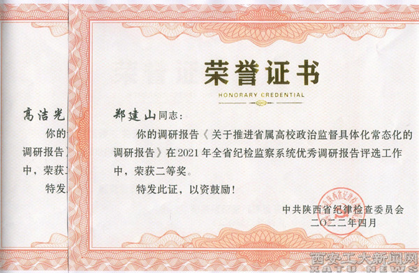 (本網訊)近日,陜西省紀委辦公廳下發《中共陜西省紀委關于表彰2021年全省紀檢監察系統優秀調研報告獲獎個人和獲獎集體的決定》(陜紀發〔2022〕3號)。校紀檢監察機構組織撰寫的《關于推進省屬高校政治監督具體化常態化的調研報告》榮獲全省紀檢監察系統優秀調研報告二等獎,是二等獎中唯一獲獎高校,在全省高校中獲獎等次位列最高。