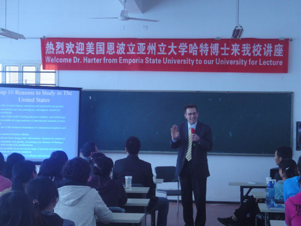 (本網訊)3月17日下午,學校邀請美國富笈教育中心(5Carts) 董事長Jimmy先生、美國國際文化交流協會、美國富笈教育中心特別顧問Harter博士舉行留美報告會。校國際交流處、外語系負責人,有意出國留學的外語系部分教師和學生以及北方信息工程學院部分學生參加了報告會。