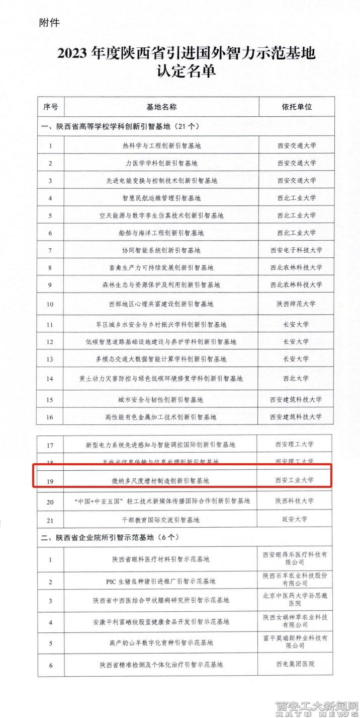 (本網訊)12月29日,陜西省科技廳公布了2023年度省引進國外智力示范基地認定名單,我校材料與化工學院申報的“微納多尺度增材制造創新引智基地”成功入選陜西省引進國外智力示范基地。此基地的成功獲批是我校省級引才引智平臺上的重大突破。
