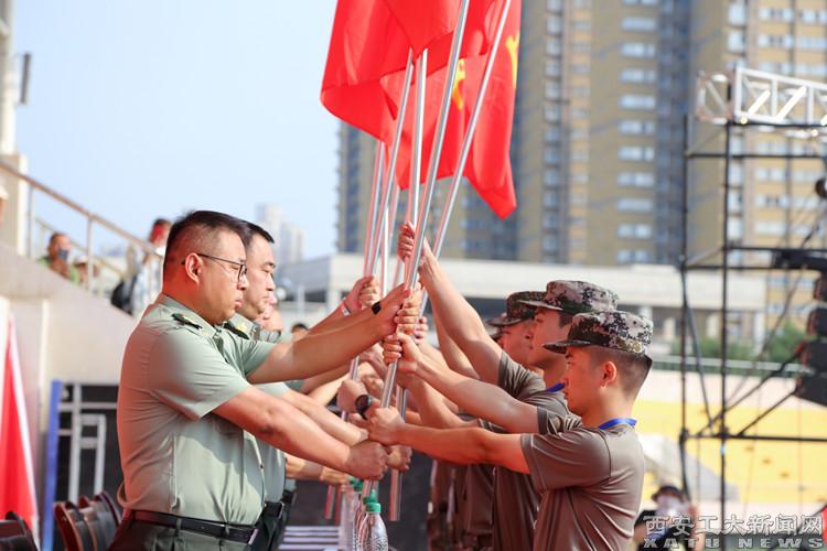 在嘹亮的軍歌聲中,軍訓旅各營、連旗幟被鄭重授予,現場氣氛莊嚴熱烈。