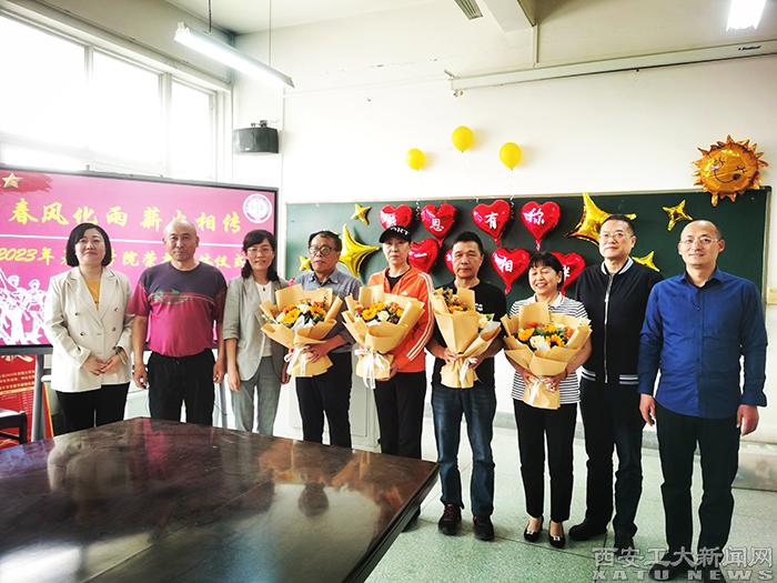 院領導為四位退休教師送上鮮花、榮休紀念品并合影留念。