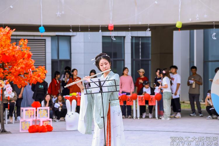 為弘揚(yáng)中國傳統(tǒng)文化,在文藝表演區(qū)域設(shè)置漢服走秀,進(jìn)一步弘揚(yáng)漢服文化。“急撥慢揉舒緩述,絲弦流露贊美情”,民樂表演者身著漢服演奏古箏、二胡等傳統(tǒng)器樂,同時(shí)伴有《水調(diào)歌頭》《燕歸巢》等歌曲及舞曲,天籟之音久久縈繞。同學(xué)們紛紛分享自己中秋節(jié)的趣味經(jīng)歷,現(xiàn)場歡聲笑語一片,充滿了歡樂喜慶、溫馨祥和的氛圍。