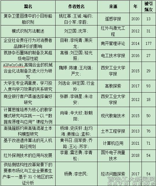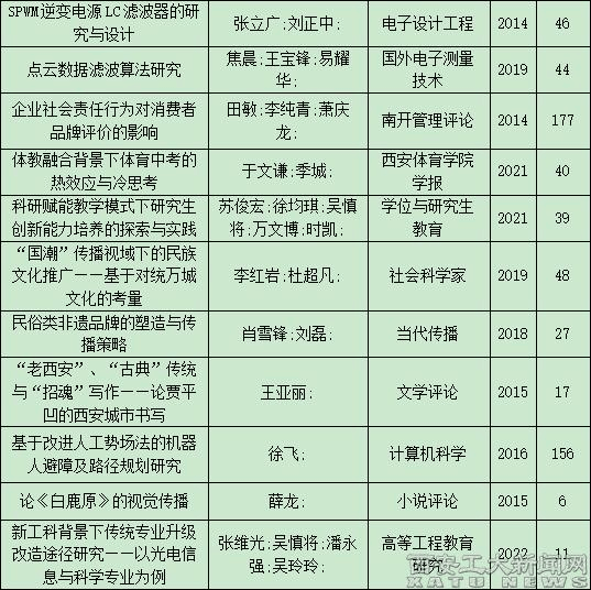 (本網訊)據中國知網《學術精要數據庫》最新數據顯示:以西安工業大學2012-2023年以來發表的11725篇知網收錄論文(其中國家基金論文2231篇,CSSCI核心論文421篇,CSCD核心論文1264篇,北大中文核心3184篇)為基礎,遴選各學科1807篇代表作入選《學術精要數據庫》,其中287篇論文入選高影響力論文,其中139篇入選高被引論文,146篇入選高下載論文,120篇入選高PCSI論文,同時為“三高”(高被引、高下載、高PCSI)論文27篇。