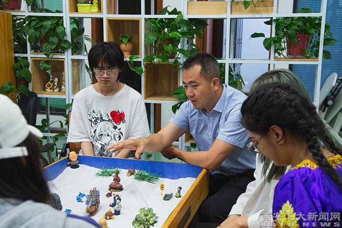 活動中,林老師借助沙盤游戲心理治療與咨詢的原理和技術,帶領同學們在自由、受保護的空間里,運用各種模型、沙具,在沙箱內呈現心靈故事,從而在意識與無意識之間架起橋梁,喚起童心,平衡身心靈。團體心理沙盤游戲是我校心理育人工作中的一種實踐探索,活動的舉辦促進了體驗者在自我覺察、自我接納的同時學會悅納他人,有助于提升大學生自我整合的能力和人際交往能力,對于增強大學生心理健康教育的實效性發揮著重要作用。