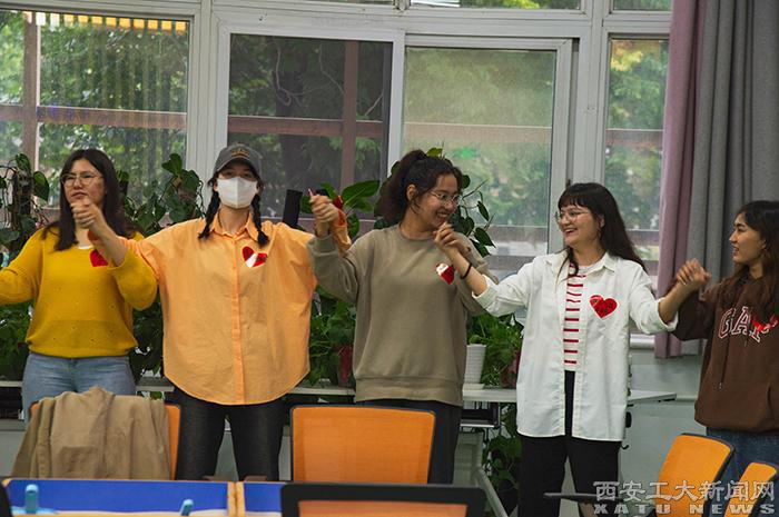 活動中,林老師帶領所有體驗者通過“相親相愛一家人”手勢舞、“滾雪球”自我介紹等破冰游戲迅速活躍現場氣氛,拉進同學們的心理距離,在開放輕松、活潑愉快的情境中熟悉彼此,建立好感。