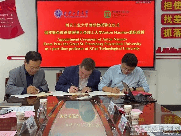 人事處處長高巍,惠增哲與Anton A.Naumov簽訂兼職教授聘任協議。劉卜為Anton A.Naumov頒發我校兼職教授聘書、并佩戴校徽。