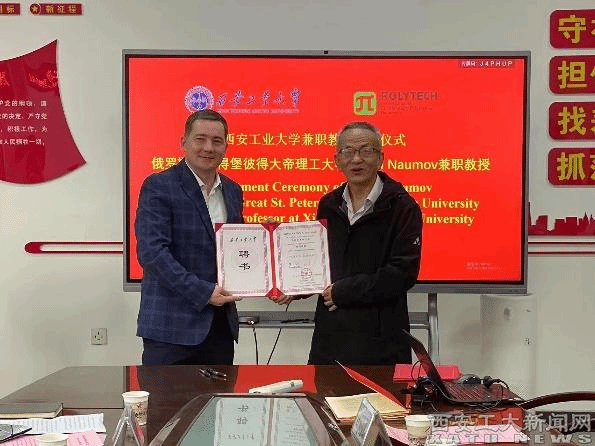 學報主編堅增運教授介紹《西安工業大學學報》發展情況,并聘任Anton A.Naumov為編委,劉卜為Anton A.Naumov頒發《西安工業大學學報》編委聘書。