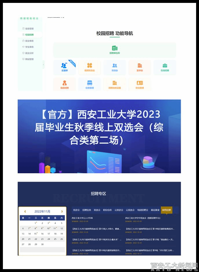 聚焦就業(yè)崗位供給,空中搭橋不斷線。在因疫情防控企業(yè)無法入校的情況下,就業(yè)處主動(dòng)與地方人社部門、重點(diǎn)企業(yè)、校友企業(yè)等聯(lián)系,完善“網(wǎng)絡(luò)雙選+空中宣講+精準(zhǔn)推送+就業(yè)官網(wǎng)官微+微信QQ群”全方位的線上招聘模式,多渠道搭建線上求職招聘平臺(tái),拓展學(xué)生就業(yè)渠道。在學(xué)校“云校招”平臺(tái)基礎(chǔ)上,聯(lián)合前程無憂搭建Job One 2022西安工業(yè)大學(xué)專屬校招求職平臺(tái),聯(lián)合智聯(lián)招聘搭建西安工業(yè)大學(xué)空中雙選會(huì)平臺(tái),持續(xù)為2023屆畢業(yè)生提供空中求職服務(wù)。舉辦“西安工業(yè)大學(xué)2023屆畢業(yè)生空中雙選會(huì)”“絲路人才國(guó)聘行動(dòng)西安工業(yè)大學(xué)2023屆畢業(yè)生秋季線上雙選會(huì)”“百校千企—?jiǎng)?chuàng)新昆山高校行西安工業(yè)大學(xué)網(wǎng)絡(luò)雙選會(huì)”等15場(chǎng),空中宣講會(huì)145場(chǎng),企業(yè)數(shù)量3439家,提供崗位18232個(gè);在線招聘從9月至今共有1088家單位在學(xué)校云就業(yè)平臺(tái)發(fā)布在線招聘信息,提供崗位38506個(gè),在線瀏覽量達(dá)到106089次,確保畢業(yè)生與用人單位在線實(shí)時(shí)互動(dòng)。