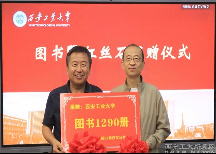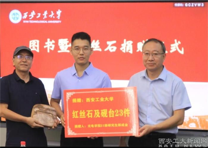 捐贈(zèng)儀式上,校友總會(huì)辦公室副主任周黎萍介紹了捐贈(zèng)的基本情況。我校81級(jí)校友馬龍向?qū)W校捐贈(zèng)了圖書1290冊,總價(jià)達(dá)3萬元。我校光電學(xué)院2021級(jí)研究生郎咸金同學(xué)及家人為學(xué)校捐贈(zèng)了銘刻學(xué)校校風(fēng)的紅絲石1件,經(jīng)加工雕刻的精美紅絲硯22件,總價(jià)值達(dá)16萬元。