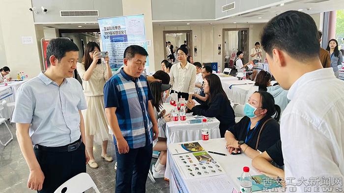校黨委副書記王發合、西安市人社局就業促進處處長廉宏彬及團市委、未央人社局、省中小企業人才市場相關領導蒞臨現場并指導工作。王書記與廉處長等一行進行了親切交談,重點了解市人才及就創業政策,并對現場學生進行就業指導。