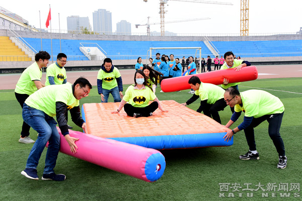 隨后進(jìn)行了趣味團(tuán)隊(duì)競(jìng)賽活動(dòng),教師發(fā)展中心副主任郭軍宣布活動(dòng)開始。40位新教工隨機(jī)分為4個(gè)隊(duì)伍,并各自確定了隊(duì)名和口號(hào),車輪滾滾、連線接力、人體冰壺和肥肥服搶板凳,大家在盡情游戲的同時(shí),展現(xiàn)了年輕教職工朝氣蓬勃、奮發(fā)進(jìn)取的精神面貌,他們發(fā)揚(yáng)團(tuán)結(jié)協(xié)作、敢打敢拼的精神,在趣味競(jìng)賽中感受共同協(xié)作的魅力,增進(jìn)了彼此的了解和友誼。