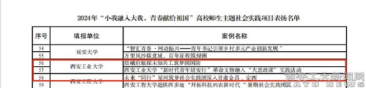 近日,中共陜西省委教育工委下發(fā)了《關(guān)于對“小我融入大我,青春獻(xiàn)給祖國”高校師生主題社會實踐項目進(jìn)行通報表揚的通知》,我校“晨曦啟航探未知兵工筑夢固國防”、“西安工業(yè)大學(xué)‘新時代青年延安行’革命文物融入‘大思政課’實踐活動”2項社會實踐活動入選。