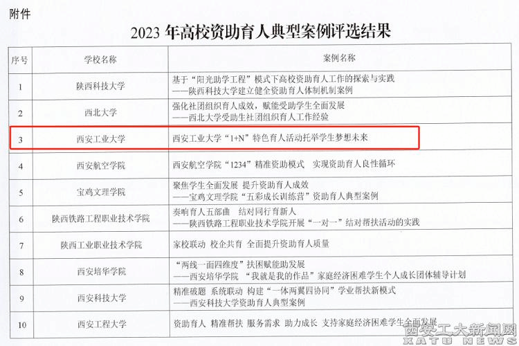 (本網訊)近日,在陜西省教育廳開展的高校資助育人典型案例評選中,我校報送的《西安工業大學“1+N”特色育人活動托舉學生夢想未來》成功入選。該案例介紹了我校積極推進“發展型”資助,創新資助育人工作的特色做法和具體措施。