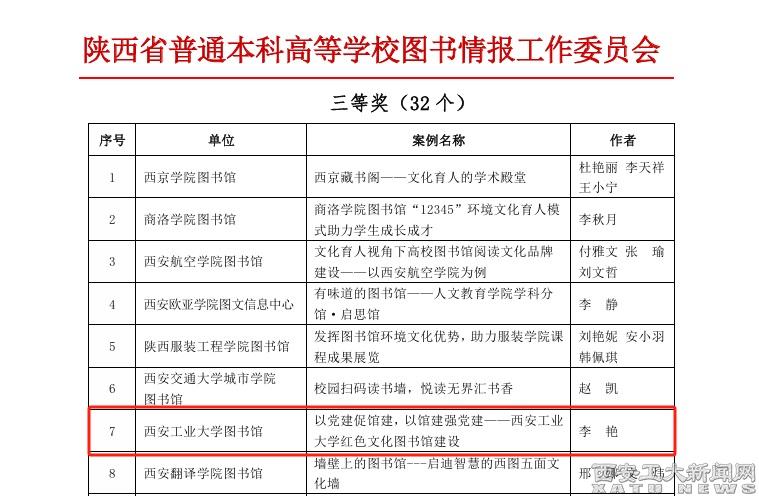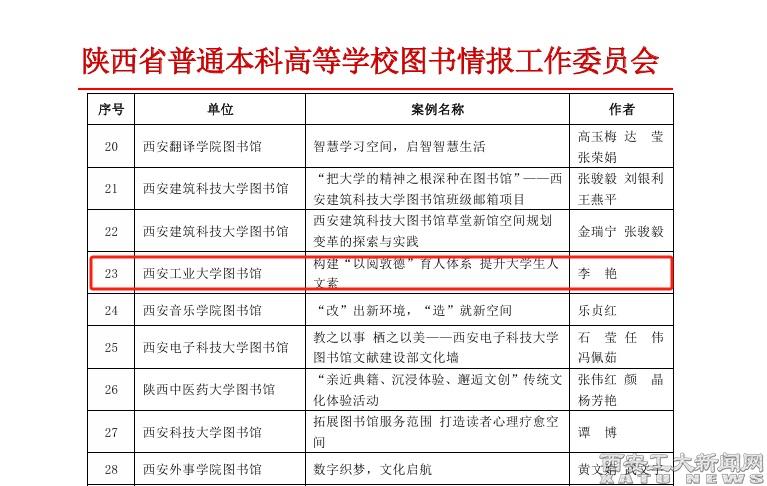 (本網訊)近日,由陜西高校圖工委舉辦的“陜西高校圖書館環境文化建設案例征集與評選活動”揭曉,我校圖書館申報的兩個案例《以黨建促館建,以館建強黨建——西安工業大學紅色文化圖書館建設》、《構建“以閱敦德”育人體系 提升大學生人文素養》均喜獲三等獎。