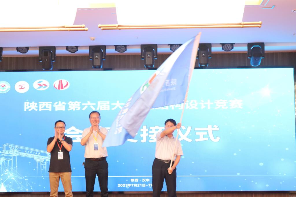 閉幕式上,我校作為下一屆省賽的主辦方,建筑工程學院院長黃華從陜西省大學生結構設計競賽組委會手中接過會旗并發言,誠摯邀請省內各兄弟院校明年相聚西安工業大學,并祝愿參賽師生勇攀高峰、再創輝煌。