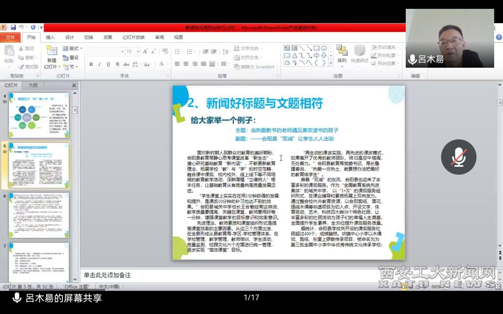 (本網(wǎng)訊)為進(jìn)一步加強(qiáng)宣傳工作隊(duì)伍建設(shè),提升從業(yè)人員專業(yè)素養(yǎng),推動學(xué)校新聞宣傳工作再上新臺階,學(xué)校組織開展兼職新聞通訊員及新媒體運(yùn)營人員業(yè)務(wù)培訓(xùn)會議。邀請陜西日報社科教文新聞部記者呂揚(yáng),以線上培訓(xùn)方式做輔導(dǎo)報告。黨委宣傳部副部長劉建兵主持會議。