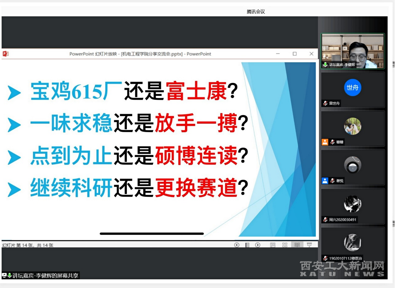 李健輝首先對疫情期間身在西安的同學們表示關心,鼓勵大家調整心態、堅定信心、樹立明確目標、做好學業規劃。他圍繞自己大學至今的四次關鍵抉擇,向大家介紹了專業實習、研究生考試、碩博學習、就業選擇四個方面的經歷,引經據典、條理清晰,給大家提供了寶貴的建議。他強調,大學生應該樹立正確的價值觀,將個人的理想與追求融入到黨和國家的事業之中,實現自身價值,在大有可為的時代大有作為。