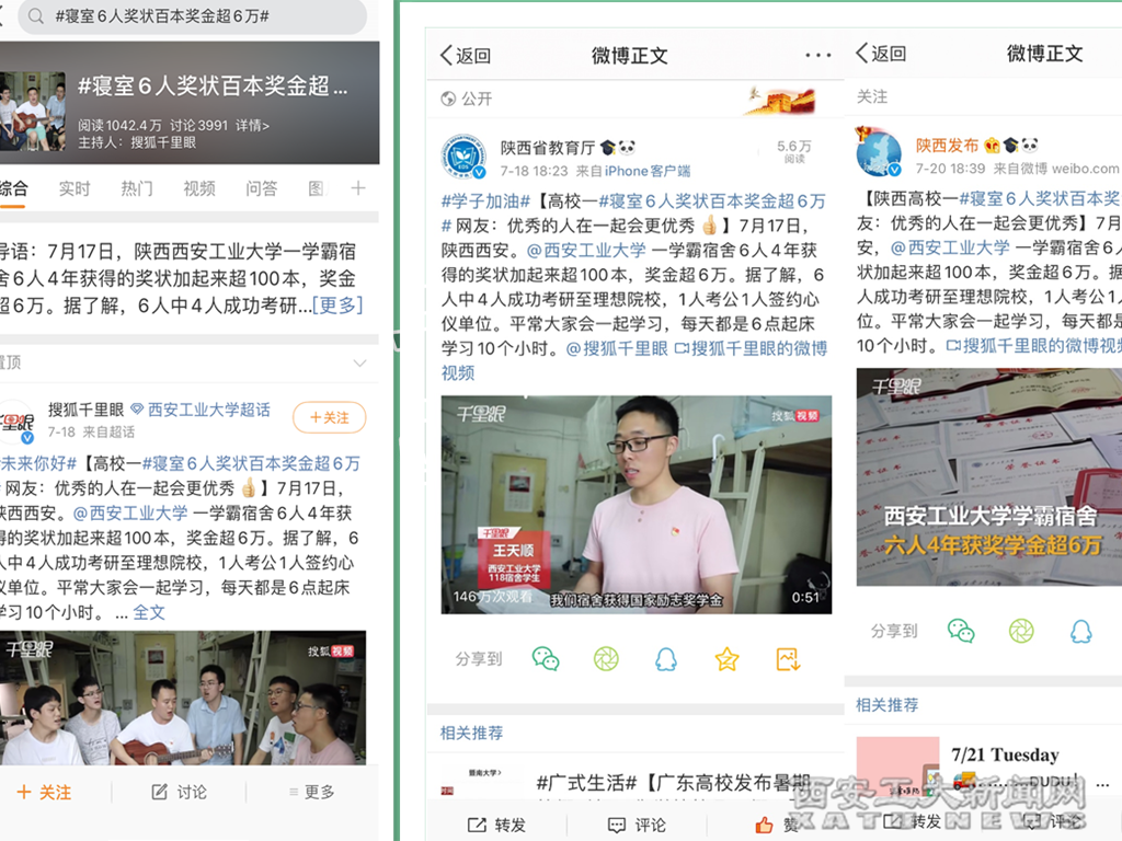 (本網訊)近日,微博上一則“寢室6人獎狀百本獎金超6萬”的話題引起網友熱議,并長期占據了西安同城熱搜榜第一位。西安工業大學建筑工程學院118號宿舍的學霸事跡被廣泛報道,受到多家媒體關注。陜西發布、陜西省教育廳、中青網、西安發布、搜狐新聞、網易視頻、三秦青年等官方媒體對該消息進行轉發報道,截止21日中午,該話題微博閱讀量已達到1043.6萬,討論數超過4000,引起強烈反響。