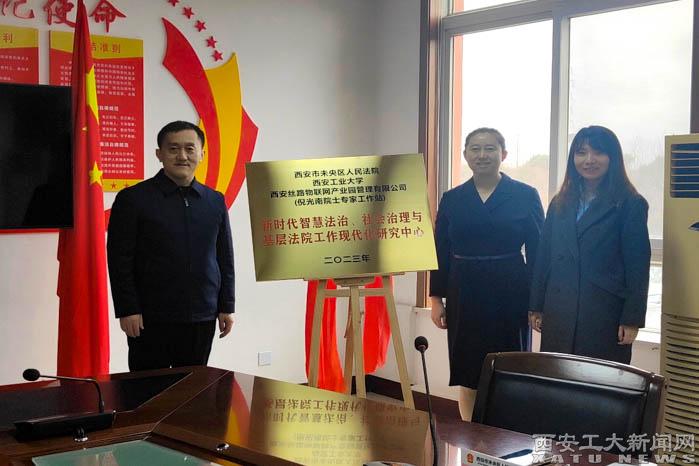 (本網訊)2月22日上午,新時代智慧法治,社會治理與基層法院工作現代化研究中心揭牌儀式在未央區未央宮法庭順利舉行。未央區人民法院院長段紅軍,副院長王紅波,未央宮人民法庭庭長郭麗華;西安絲路物聯網產業園管理有限公司、倪光南院士專家工作站發展合作部主任毛真;我校經濟管理學院院長蘇兵,黨委書記姬浩,黨委副書記王育曉,副院長焦源出席并揭牌。
