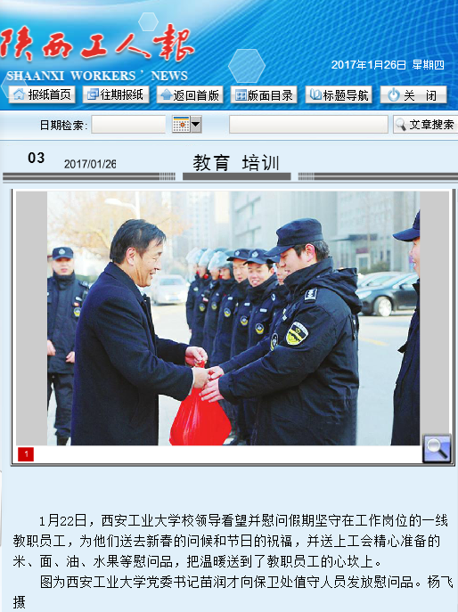 【《陜西工人報(bào)》】西安工業(yè)大學(xué)校領(lǐng)導(dǎo)看望并慰問(wèn)假期堅(jiān)守在工作崗位的一線教職員工(20170126)