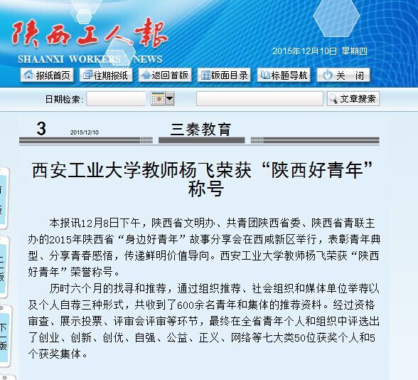本報(bào)訊 12月8日下午,陜西省文明辦、共青團(tuán)陜西省委、陜西省青聯(lián)主辦的2015年陜西省“身邊好青年”故事分享會(huì)在西咸新區(qū)舉行,表彰青年典型、分享青春感悟,傳遞鮮明價(jià)值導(dǎo)向。西安工業(yè)大學(xué)教師楊飛榮獲“陜西好青年”榮譽(yù)稱號(hào)。