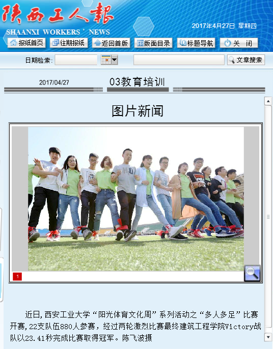 近日,西安工業(yè)大學(xué)“陽光體育文化周”系列活動(dòng)之“多人多足”比賽開賽,22支隊(duì)伍880人參賽,經(jīng)過兩輪激烈比賽最終建筑工程學(xué)院Victory戰(zhàn)隊(duì)以23.41秒完成比賽取得冠軍。