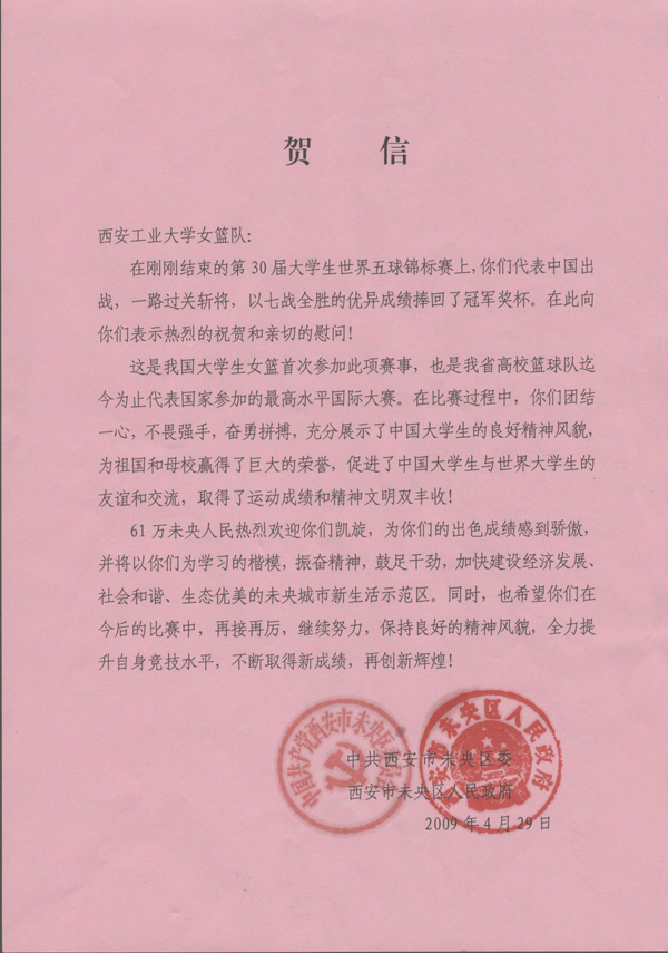 賀信中說:這是我國大學生女籃首次參加此項賽事,也是我省高校籃球隊迄今為止代表國家參加的最高水平國際大賽,61萬未央人民熱烈歡迎你們凱旋,為你們的出色成績感到驕傲,并將以你們為學習的楷模,振奮精神,鼓足干勁,加快建設經濟發展、社會和諧、生態優美的未央城市新生活示范區。同時,也希望你們在今后的比賽中,再接再厲,繼續努力,再創新輝煌!