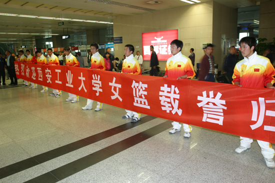 (本網訊)日前,在第30屆大學生世界五球錦標賽上,代表中國出戰的西安工業大學女籃,以7戰全勝的戰績為中國捧回冠軍獎杯。西安工業大學女籃“九朵金花”輾轉飛行16小時后,于4月27日19:30抵達西安咸陽國際機場。西安工業大學副校長張君安到機場歡迎女籃載譽歸來。