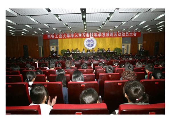 (本網訊)3月20日下午,西安工業大學召開深入學習實踐科學發展觀活動動員大會。省委教育工委高校學習實踐活動指導檢查組第一組組長、西安石油大學黨委副書記、紀委書記祝亞榮,副組長、省教育廳基礎教育處副處長李根民以及指導檢查組成員田虹霞蒞會,校黨委書記、學習實踐活動領導小組組長賽云秀,校長、黨委副書記、學習實踐活動領導小組副組長劉江南,黨委委員、副校長張君安、劉建勛、陳俊斌、劉衛國等領導出席了大會。會議由劉江南主持。