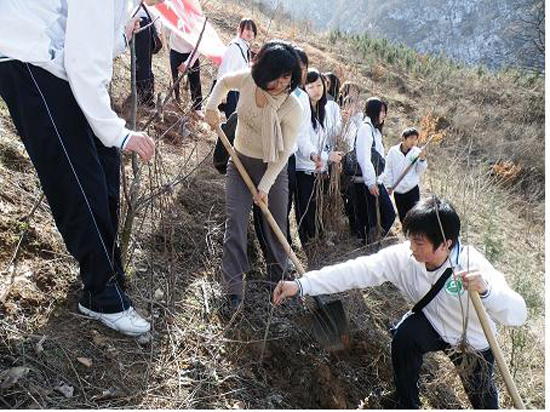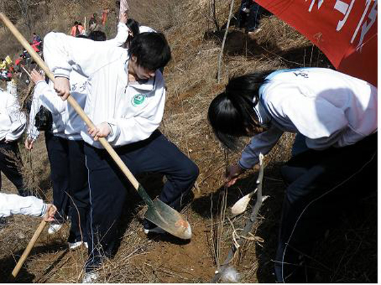 早晨9時,在太平峪森林公園的山坡上,同學們與千名前來參與植樹的市民一起揮鍬培土,提水澆灌,一棵棵紫荊樹幼苗在大家精心的栽植下挺立起來。植樹現場,到處是一派熱火朝天的勞動場面,僅一上午,就新種下了上千株樹苗,為西安又增添了一道綠色風景線。