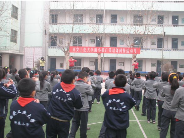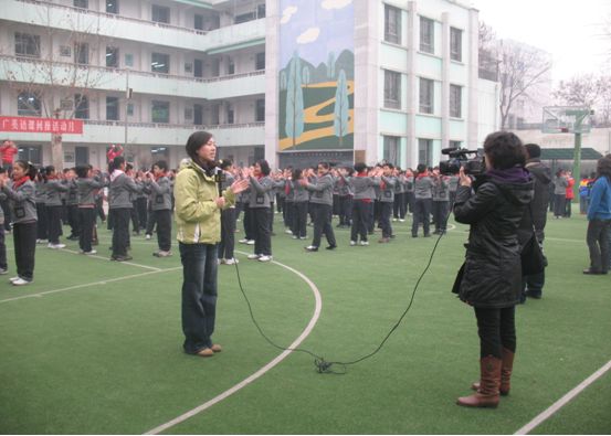 “one,two,three,go! Mother,father,brother……”隨著動(dòng)感的音樂和舞動(dòng)的節(jié)拍,學(xué)生的情緒瞬間高漲起來,喊著口號(hào)投入到課間活動(dòng)的鍛煉中去。此舉巧妙地將體育鍛煉與英語學(xué)習(xí)融為一體,極大地激發(fā)了學(xué)生學(xué)習(xí)英語的熱情,不失為一項(xiàng)值得借鑒的好措施。西安電視臺(tái)《都市快報(bào)》、《今晚播報(bào)》分別對(duì)此進(jìn)行了報(bào)道。