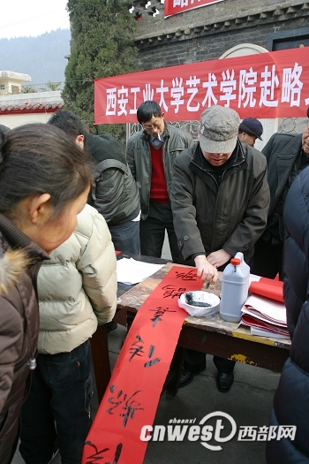 在捐贈儀式現場,西安工業大學藝術學院的師生們現場揮毫,為災區創作了“自強不息”、“團結就是力量”、“知識就是財富”等書法作品,還為聞訊趕來的鄉親們書寫了數百副春聯。同行的分別來自美國、吉爾吉斯斯坦和日本的四位友人,也揮毫潑墨,他們書寫的春聯贏得災區群眾的掌聲。據悉,自去年“5.12”大地震發生后,西安工業大學多次舉辦了形式多樣的賑災義賣活動,所得數萬元款項均捐給了地震災區。