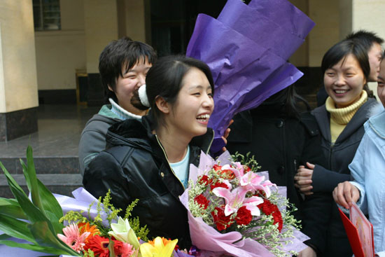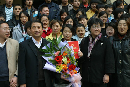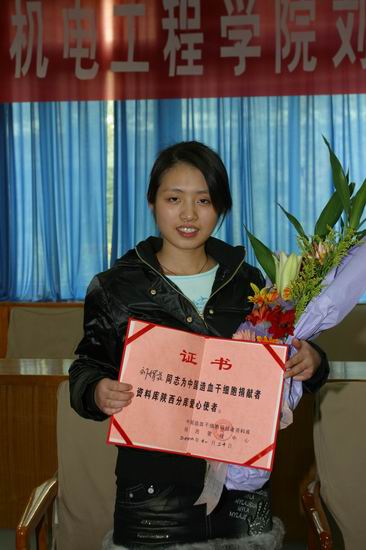 陜西省紅十字會和西安工大領導向劉娟花同學獻花并頒發了證書,向她獻上了水晶制作的“愛心天使”做紀念,同學們也向劉娟花獻上鮮花并送上最真摯美好的祝愿。