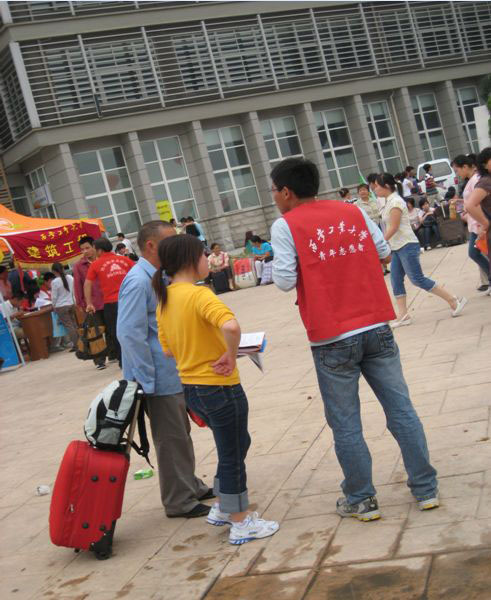 9月1日,2日是新生報道的日子,除了每個院系在經緯廣場迎新接待外,校團委也組織安排青年志愿者協會的成員積極參與其中,幫助新生搬行李,向他們介紹學校的情況,新生的臉上露出了絲絲的喜悅和好奇,而家長的臉上也流露出了滿意的笑容。