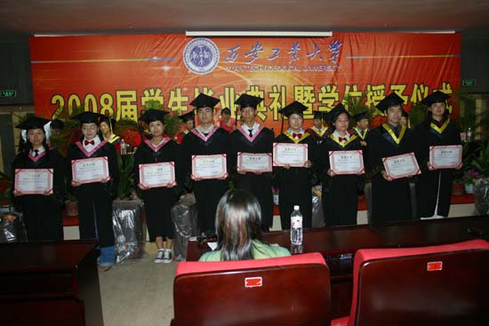 學(xué)生處處長(zhǎng)任慧英宣布省級(jí)優(yōu)秀畢業(yè)生、優(yōu)秀學(xué)生干部、校級(jí)三好表彰名單。2008屆學(xué)生畢業(yè)生中趙雁鵬6人獲得省級(jí)優(yōu)秀畢業(yè)生榮譽(yù)稱(chēng)號(hào),羅曉樂(lè)等31人獲得省級(jí)優(yōu)秀畢業(yè)生榮譽(yù)稱(chēng)號(hào),1478名畢業(yè)生和277名畢業(yè)生分別獲得校級(jí)優(yōu)秀畢業(yè)生和優(yōu)秀學(xué)生干部榮譽(yù)稱(chēng)號(hào)。在激昂的進(jìn)行曲中參會(huì)領(lǐng)導(dǎo)為獲獎(jiǎng)畢業(yè)生頒發(fā)獎(jiǎng)品和榮譽(yù)證書(shū)。