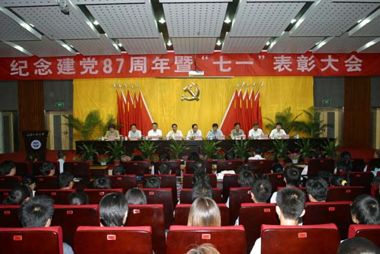 校黨委書記賽云秀在會上做了重要講話。他首先代表校黨委,向全校共產黨員致以節日的問候,向受到表彰的先進集體和個人表示熱烈祝賀并致以崇高的敬意。他在講話中回顧了中國共產黨87年的光輝歷程,對我校黨建工作取得的成果進行了總結。號召全校各級黨組織和廣大共產黨員認真貫徹落實黨的十七大會議精神,以改革創新精神全面推進學校黨的基層組織建設,以黨的先進性推動和諧校園建設,使學校改革發展穩定的各項事業不斷取得新的成就。