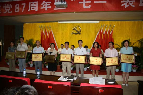 黨委副書記、校長劉江南宣讀了《關于表彰2007-2008學年度先進黨總支部先進黨支部優秀共產黨員和分黨委(黨總支直屬黨支部)評估優秀單位的表彰決定》,黨委委員為受表彰的基層黨組織代表和個人頒獎。