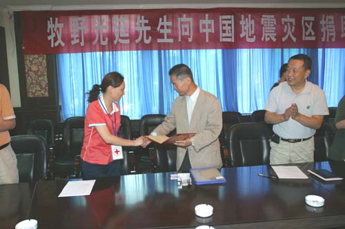 國際交流處處長路金龍向與會人員介紹了牧野先生的教學工作情況以及在抗震救災中所作的貢獻,高度贊揚了牧野先生的國際人道主義精神。牧野先生親自將10000元人民幣交到陜西省紅十字會辦公室何紅副主任手中, 何紅副主任代表紅十字會向牧野先生頒發(fā)證書。