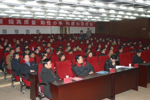 大會在莊嚴的國歌聲中開幕。校長劉江南作了題為《團結一心,銳意進取,勤儉辦學,和諧發展,為實現學校“十一五”各項目標努力奮斗》的學校工作報告。劉校長回顧了2007年學校主要工作,并就當前學校改革發展的形勢和2008年主要工作做了部署:一是要強化管理、勤儉辦學,降低多校區管理模式下的運行成本;二是要鞏固評建成果,落實質量工程,提高人才培養質量;三是要加強學科建設,優化學科專業布局;四是要提升科研層次和水平,促進學產研結合;五是要推進“人才強校戰略”,優化人才隊伍結構;六是要做好招生就業工作,加強大學生思想政治教育工作和日常教育管理;七是要推進“創新興校”戰略,深化管理體制和運行機制改革;八是要認真做好穩定安全工作,不斷改善辦學條件,努力構建和校園。
