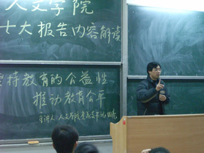 12月10日,人文學院組織06級全體學生觀看了胡錦濤總書記作的十七大報告錄相。同學們都深有感觸,紛紛遞交了“學習十七大精神感言”,有的就十七大中提出的教育理念,聯系切身實際,從學校注重培養新型人才、加大學校軟硬設施的投入、關注貧困生的生活學習狀況等多方面談了自己的感想;有的就三農問題、科學發展觀問題、社會保障體系等各方面作了探討。12月11日,學院組織全體學生學習十七大報告,黨總支書記田亮作了題為《堅持教育公益性 推動教育公平》的輔導報告。田老師認為,黨的十七大報告中有關教育工作的論述有五大亮點,分別是:教育是針對民族振興的基石、堅持教育的公益性、教育公平是社會公平的基礎、加大財政對教育的投入及建立終身學習的學習型社會。他指出,教育的命運和人生的命運息息相關,胡錦濤總書記在黨的十七大報告會上指出:中國的教育是建立在新的起點上的。在國家重視教育的大好形勢下,學院將響應黨的號召,貫徹十七大的教育精神,帶領同學們迎接新的挑戰。他希望廣大學生努力學習專業知識并提高綜合素質,為自己的四年大學交出一份滿意的答卷,為自己今后的發展奠定堅實的基礎。